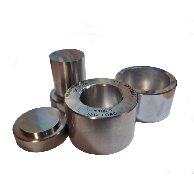 Сборная пресс-форма с 50 мм внутренним диаметром из закаленной стали для сухого прессования в гранулы, форма запрессовки цилиндр.Характеристики.Максимальное давление: 100 тоннТвердость по Роквеллу: Rc..
